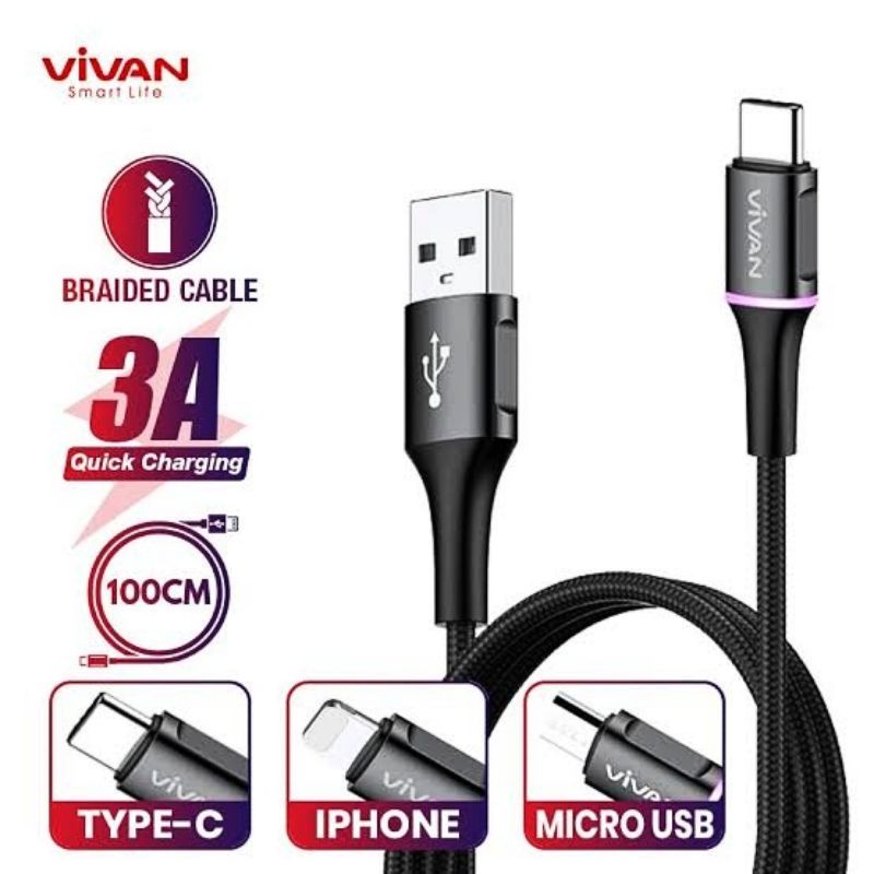 .Spesifikasi - Merk: Vivan - Model: VDM100 [Micro] VDC100 [Type-C] VDL100 [Lightning] - Material: bare copper wire + copper foil wire - Voltage: 5V - Current: Micro & Lightning 2.4A(MAX), Type C 3.0A(MAX) - Cover: black TPE material + black PP yarn weaving - Color: Black - Length: 1M - USB plug times: 10000 times - Salt spray test: 24H - Bending test: 4000 times+ - High and low temperature storage: minus 20 plus 70 degrees