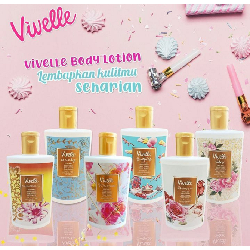 Vivelle Parfumed Brightening Body Lotion 250ML : * Shimmering Joy Aroma jeruk segar, bunga mawar dan apel merah, terinspirasi parfum My Burberry * Lovely Aroma Sweet Baby, Karya Aroma/Givaudan, Lily, Rose, Musk, terinspirasi parfum Victoria's Secret Eau So Sexy * Adore Aroma bunga segar fressia, terinsipirasi dari parfum Victoria's Secret Romance Wish. Wangi agak segar dan lembut * Beautiful Life Aroma buah dan bunga mawar, dan sentuhan kesturi dan wangi kayu yang lembut, terinspirasi parfum Paul Smith Rose * Precious Love Terinspirasi dari Forbidden Rose by Avril Lavigne. Aroma apel, persik, vanilla, lotus, dan sedikit heliotrope, cendana & coklat Meksiko * Mon Amour Aroma saffron, bunga mawar, dry amber, moss dan musk. Terinspirasi dari Baccarat Rouge 540 by Francis Kurkdjian