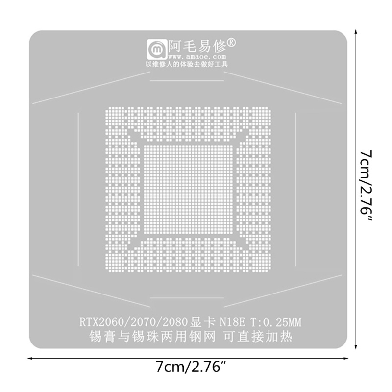 Templat Baja Solder Stensil Reballing BGA untuk Stasiun Reball IC RTX2080 Merek baru dan berkualitas tinggi Fitur: baru dan berkualitas tinggi Stensil ini terbuat dari stainless steel berkualitas tinggi, ketebalan jala baja sempurna. Proses kalsinasi yang kompleks dan tepat, sehingga stensil memiliki ketebalan yang sesuai dan kinerja yang sangat baik. Mereka dapat dipanaskan oleh mesin udara panas, stensil ini tidak mudah berubah bentuk saat dipanaskan. Spesifikasi ditandai di permukaan, nyaman untuk Anda pilih. Ini dirancang khusus untuk laptop, desktop, jembatan utama papan komunikasi utara-selatan, dan kartu grafis, dll semua jenis chip BGA.