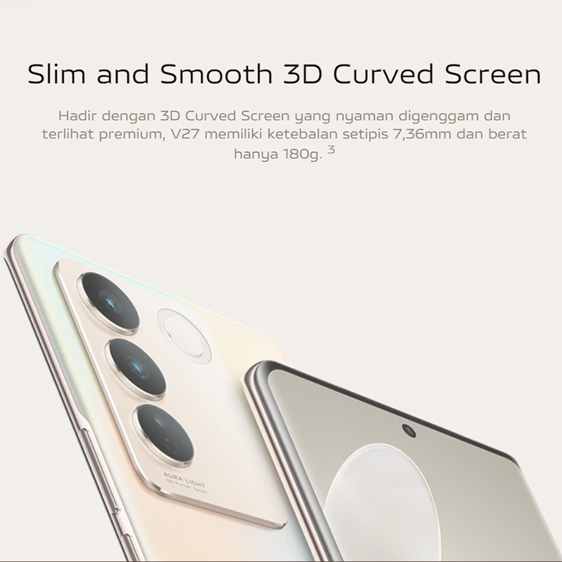 Vivo V27 5G ✅Prosesor MediaTek Dimensity 7200 RAM&ROM 8GB + 256GB 🔋Baterai 4600 mAh (TYP) 🔋Fast Charging 66W (11V/6A) 🎨Warna Noble Black, Flowing Gold Sistem Operasi Funtouch OS 13 Global Tampilan Layar 6,78 inci Resolusi 2400 × 1080 (FHD+) Tipe AMOLED 📷Kamera Depan: 50 MP AF / Belakang: 50 MP OIS + 8 MP Super Wide-Angle + 2 MP Super Macro Aperture Depan: utama f/2,45 Belakang: utama f/1,88, Super Wide-Angle f/2,2, Super Macro f/2,4 Flash Aura Light Portrait (flash) Koneksi Wi-Fi 2.4 GHz, 5 GHz Bluetooth Bluetooth 5.3 USB Type-C GPS Didukung OTG Didukung NFC Didukung ✅bonus bawaan unit : soft Case+ Antigores ( sudah terpasang ) + headset ( kalau ada ) ✅bonus tambahan dari toko sesuai dengan pilihan yang anda PILIH saat melakukan CHEKOUT.