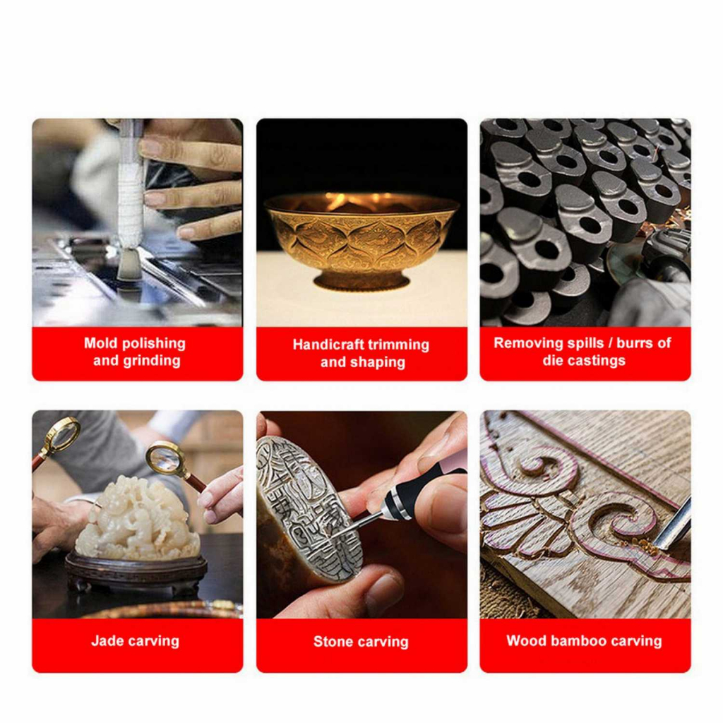 Bor Mini Multifungsi Tidak perlu membeli mata bor secara terpisah. Anda akan mendapatkan berbagai mata bor yang dapat digunakan untuk mengukir kayu, mengukir segel, mengasah rantai gergaji, memoles batu giok dan media lain.