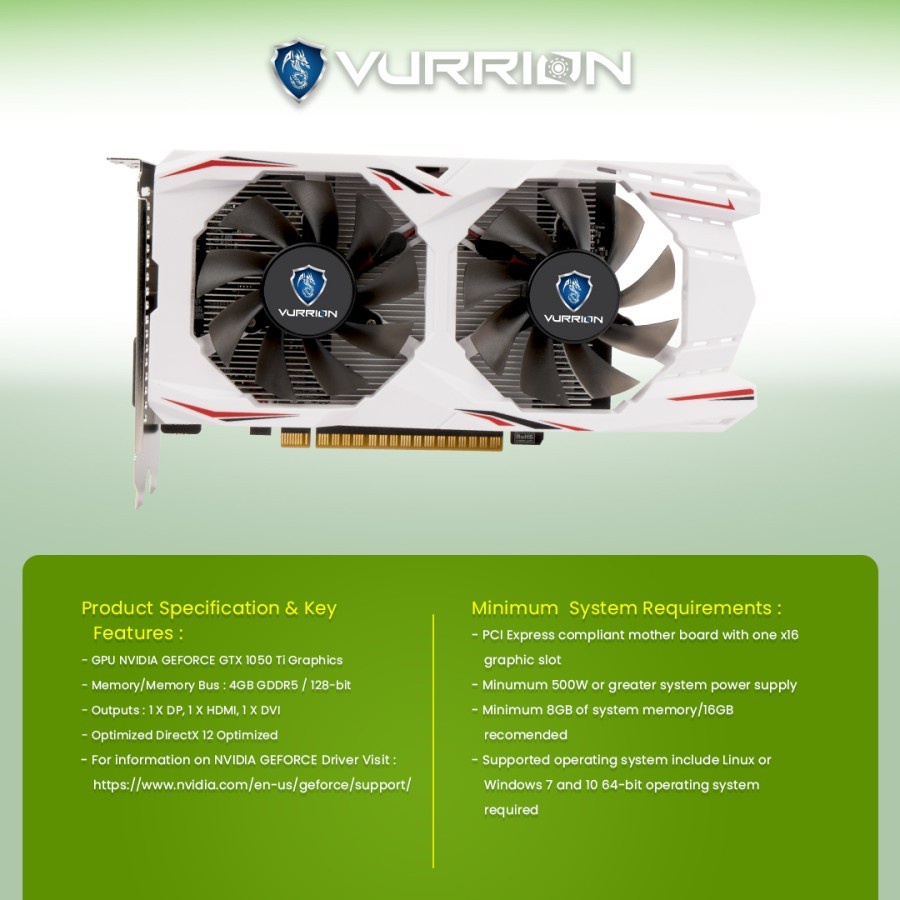 Vga Vurrion GTX1050Ti 4GB GDDR5 128bit Single Fan - GPU : GP107 - Shaders : 768SP - GPU Clock : 1290MHz - Memory Clock : 7000MHz - Memory Size : 4096 MB - Memory Type : DDR 5 - Memory Width : 128 bit - Output : DVI / HDMI / VGA - Cooling System : Single Fan
