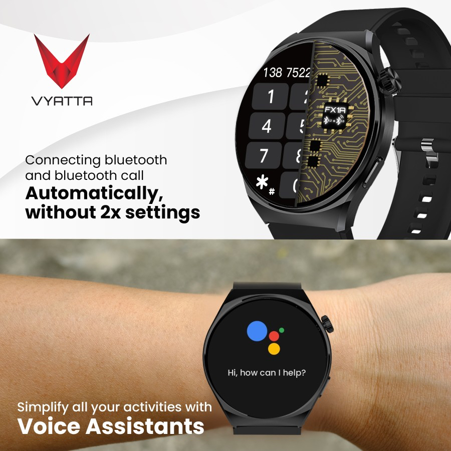 Specification: Model Number : VFM-5P Chipset : VYATTA FX2A Display : Round, AMOLED 60 Hz Size : 1.43” inch Resolution : 455 x 466 px, 461ppi Brightness : 500 nits Sport Mode : 10 IPX : 7 Battery : 330 mAh Working Time : Up to 7 Days Standby Time : Up to 20 Days Bluetooth Version : 2 in 1 (BT 5.3 + BT 3.0) Charging : Wireless Charging Dock APP : VYATTA FITME