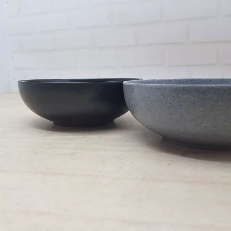 Mangkok yang didesign dalam bentuk bulat ceper model batu warna abu abu. Mangkok ini biasa digunakan untuk Mie, Sayuran atau makan lainnya dengan warna tradisional tembikar. Mangkok yang biasa digunakan di Restoran, Resto, Hotel, Cafe dan Lainnya.