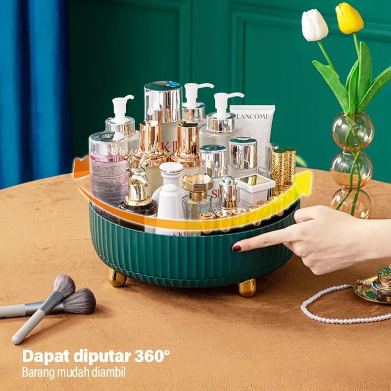 Keunggulan Produk : - Bahan plastik extra tebal, waterproof dan anti-bakteri - Bahan material ramah lingkungan, dan lebih tahan lama - Desain wadah storage bulat sehingga lebih spacious - Barang dapat dilihat dari segala sisi - Bisa digunakan di meja makan, ruang tamu, kamar tidur, lemari, kamar mandi dll - Serbaguna dapat digunakan sebagai wadah barang/bumbu/buah/kosmetik/snack dll - Wadah penyimpanan model putar 360 derajat, mudah akses - Mudah dibersihkan - Dipadu dengan warna vintage yang elegan menambah estetika ruangan