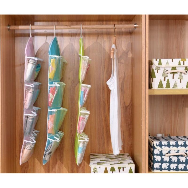 Pouch Hanging Organizer 16 Sekat Korean Set Tempat Celana Dalam Gantung adalah solusi buat anda yang ingin menyimpan barang atau celana dalam jadi tersimpan rapi dan mudah diambil saat hendak dipakai. Pouch terdiri dari 16 sekat transparan, tiap sekat dapat di isi 3-4 pcs celana dalam. Pouch dapat digantung ke hanger, mumudahkan untuk digantung di dalam lemari. Bagian atas terdapat lobang untuk hanger. Selain untuk tempat panties, pouch juga dapat digunakan untuk tempat menyimoan aksesoris. Dengan sekat yang cukup banyak, bisa diisi dengan aneka aksesoris seperti kalung, gelang, anting dan pernak pernik lainnya.