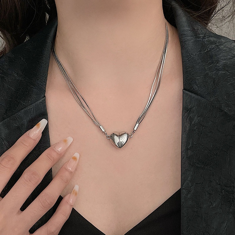 Detail Wanita Gadis Sederhana Kreatif Magnetik Cinta Hati Liontin Kalung Indah Serbaguna Warna Perak Multi-layer Rantai Ular Kalung Perhiasan