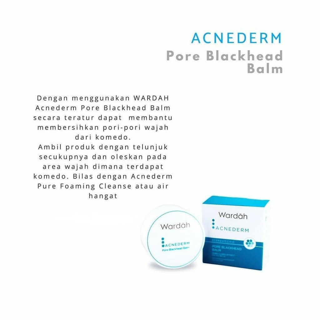 Kegunaan : ✔Bantu mengurangi blackhead/komedo di wajah. ✔Bantu rawat kulit yang berjerawat (untuk hasil maksimal gunakan semua series Wardah Acnederm). ✔Bantu menyerap minyak berlebih di pori-pori kulit. ✔Bantu melembabkan kulit. ✔Kulit terasa halus dan lembut. ✔Tekstur Balm yang lembut dengan formula nyaman di kulit.