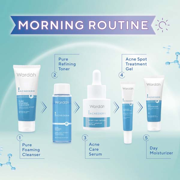 1 rangkaian Wardah Acnederm Series terdiri dari: ♡ Acnederm Pure Foaming Cleanser (Bersihkan debu, kotoran dan minyak dari kulit wajah) ♡ Acnederm Pore Refining Toner (Bantu meringkas pori-pori kulit wajah) ♡ Acnederm Pore Blackhead Balm (Bantu kurangi komedo | blackhead) ♡ Acnederm Acne Spot Treatment Gel (Perawatan untuk jerawat) ♡ Acnederm Day Moisturizer (Menjaga hidrasi dan melindungi kulit dari sinar UV) ♡ Acnederm Night Treatment Moisturizer (Membantu menyamarkan noda bekas jerawat & mencerahkan kulit) ♡ Acnederm Face Powder (Mencerahkan & mengurangi tampilan kilap di wajah)