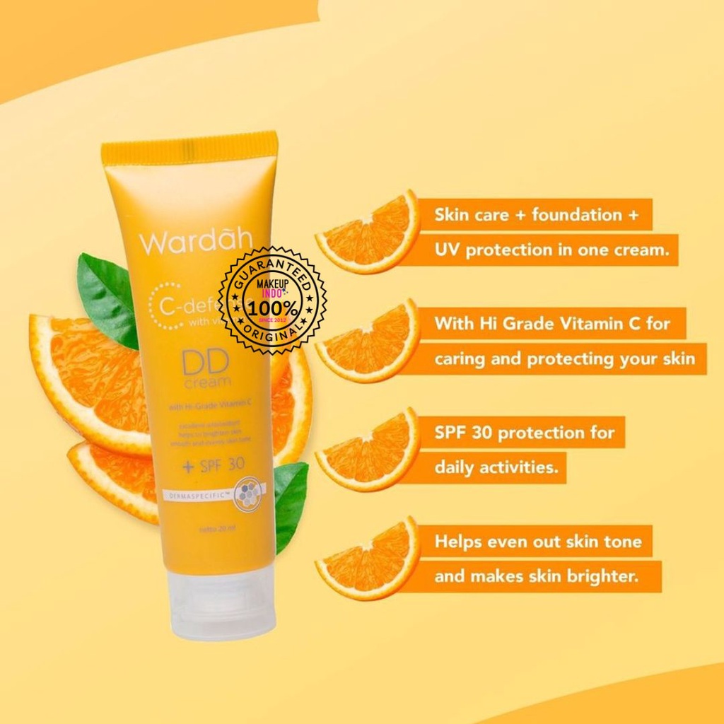 Wardah C-defense DD Cream dengan Hi-grade Vitamin C, merupakan krim dengn tekstur lembut dan nyaman di kulit. Merupakan kombinasi lightening, tabir surya, dan antioksidan untuk kulit tampak bercahaya. Mengandung vitamin B3 yang membantu membuat kulit tampak cerah.