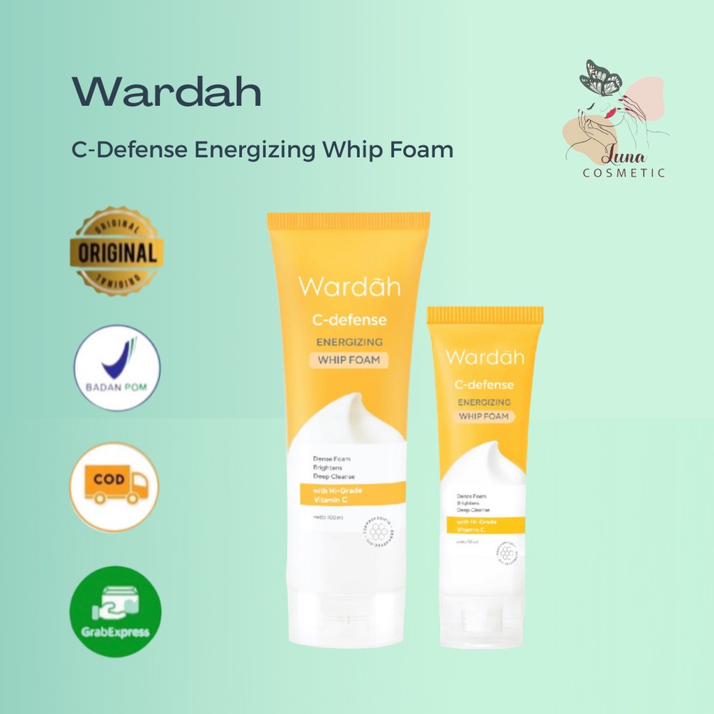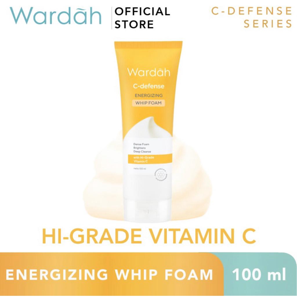 Wardah C-defense Energizing Whip Foam, pembersih wajah dengan Dense Whip Particles menghasilkan busa 3x lebih padat*, terasa kenyal dan lembut membersihkan kulit wajah hingga ke pori dari polusi **, make-up, serta minyak berlebih. Dengan kandungan Hi-Grade Vitamin C yang berperan sebagai antioksidan dan menjadikan kulit tampak lebih cerah.