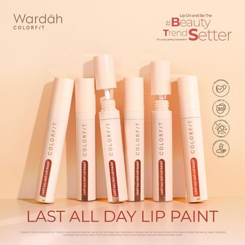 Wardah Colorfit Last All Day Lip Paint merupakan liquid lip dengan matte finish dan tekstur creamy yang mudah dibaurkan serta intense dalam satu usapan (one swipe coverage). Formulanya tidak transfer (non-transfer) dan tahan lama hingga 12 jam (longlasting up to 12 Hrs) sehingga nyaman digunakan seharian. Terdiri dari 6 varian warna wearable yang cocok untuk berbagai skin tone.