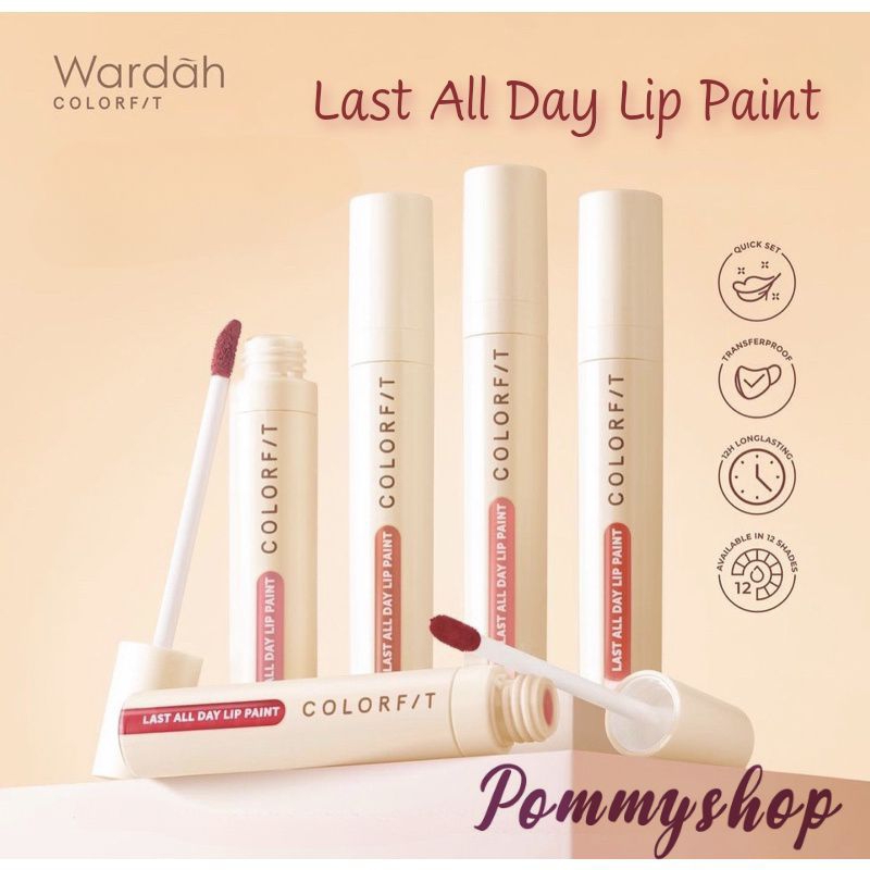 "Wardah Colorfit Last All Day Lip Paint adalah liquid lip dengan tekstur creamy yang mudah dibaurkan dan intense dalam satu usapan (cover in one stroke). Lip Paint dengan Formulanya yang tidak transfer (transferproof) dan tahan lama (longlasting) hingga 12 jam sehingga nyaman digunakan seharian.