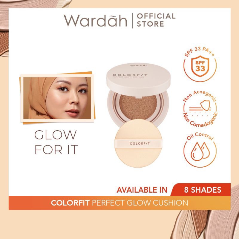 Wardah Colorfit Perfect Glow Cushion merupakan base makeup dengan glow finish dan high coverage yang mampu menutupi noda hitam dan bekas jerawat pada wajah. Cushion dilengkapi dengan Glow-Perfecting Pigment yang memberikan efek glow hingga 12 jam tanpa terkesan berminyak serta SkinMatch Technology sehingga warnanya mampu menyatu sempurna dengan warna natural kulit. Formulanya terasa lembap di wajah dan mampu memberikan perlindungan pada kulit dengan SPF 33 PA+++