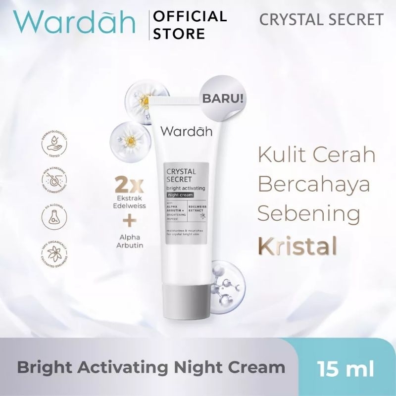 "Wardah White Secret Night Cream adalah krim pelembap kulit wajah yang digunakan pada malam hari untuk membantu proses pencerahan kulit selama sel kulit beregenarasi ketika kamu beristirahat. Mengandung Crystal White Active yang mencerahkan kulit hingga lapisan epidermis terdalam. Derma Peptide Technology dalam krim ini membantu membuat kulit terlihat lebih halus.