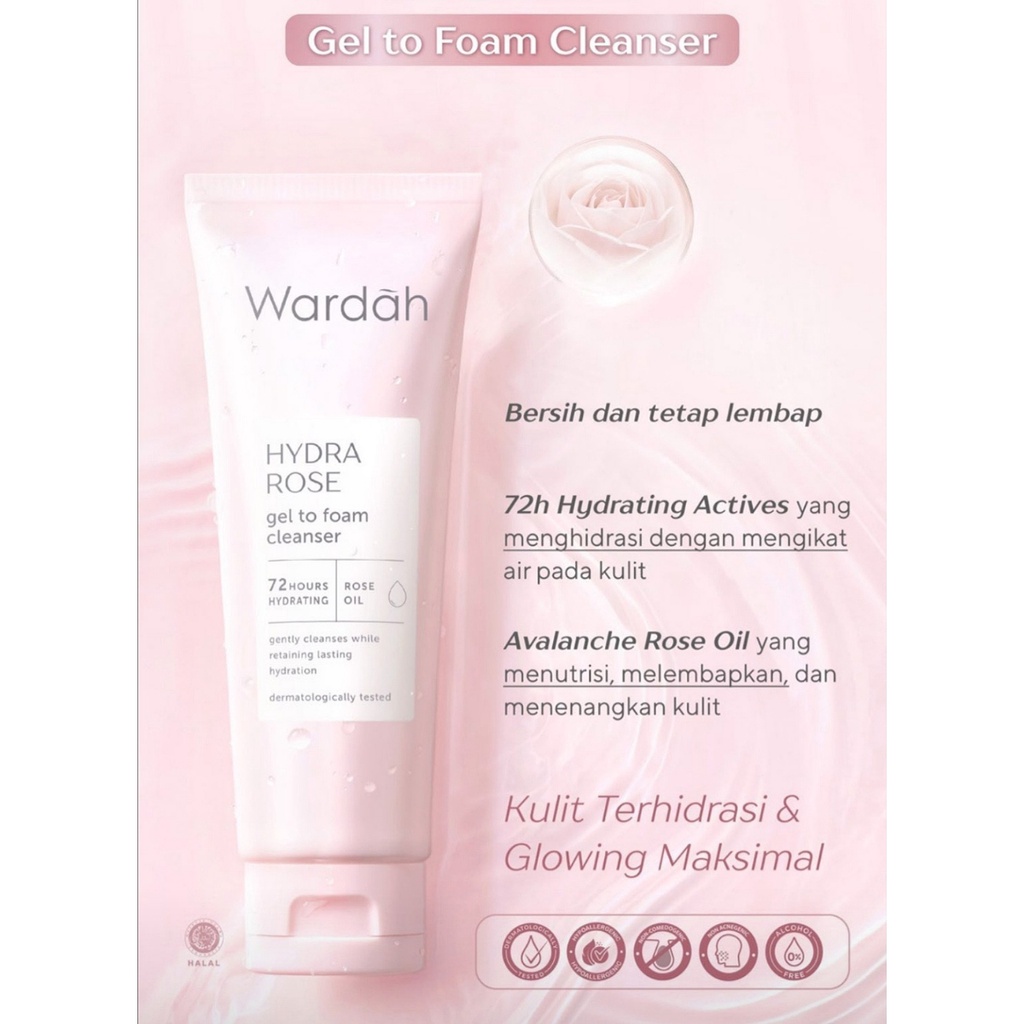 WARDAH Hydra Rose Gel To Foam Cleanser merupakan Mild Foaming facial wash dengan tekstur gel yang lembut dan kandungan 72 hours hydration active serta rose oil di dalamnya, membersihkan wajah dari debu, minyak, kotoran dan sisa make-up tanpa membuat kulit terasa kering setelah dibilas. Kulit bersih dan terjaga kelembabannya.