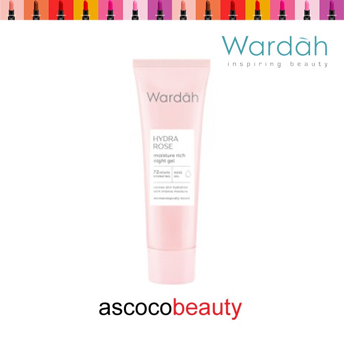 ❀ Wardah Hydra Rose Moisture Rich Night Gel [17 mL] ❀ Wardah Hydra Rose Moisture Rich Night Gel, pelembap dengan tekstur gel kaya nutrisi mengandung 72 Hours Hydrating Active dan Rose Oil yang menghidrasi serta menjaga kelembapan kulit.