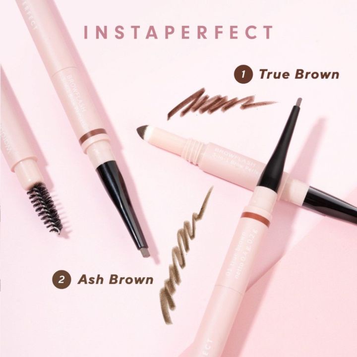 BARU! Instaperfect BROWFLASH 3 in 1 Brow Perfector adalah pensil alis mekanik yang terdiri dari ujung pensil untuk membingkai alis, powder puff sebagai fitur rahasia untuk mengisi alis, dan spoolie brush untuk membaurkan dan merapikan alis. Tampilan alis yang natural maupun bold, semua mungkin! Get your perfect WOW Brow in a Flash!