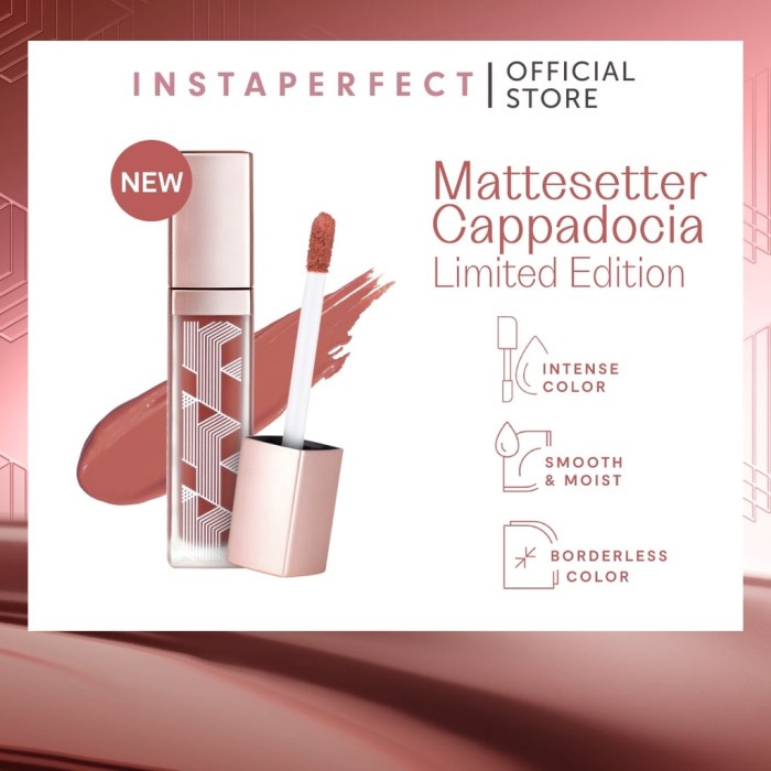 "Instaperfect Mattesetter Lip Matte Paint LIMITED CAPPADOCIA EDITION adalah lip cream dengan glam thematic design yang terinspirasi dari keindahan Cappadocia di Turki dengan 6 nudetittude & more bold color yang cocok untuk semua lip tone dan skin tone. Memiliki hasil lavish matte (matte yang lembab), menutupi garis bibir dalam 1 usapan, lembut serta terasa lembab (dengan velvety texture yang halus saat dioles), dan tahan lama. - Tidak membuat bibir kering & cracking - Diperkaya dengan Avocado dan Jojoba Oil - Tersedia dalam 6 warna limited: 4 warna nude (shade 10-13) dan 2 warna yang lebih bold (shade 14 dan 15) - Antioksidan dari Green tea dan Kiwi extract - Dilengkapi Ectoin untuk perlindungan dari dalam (mengembalikan kandungan hidrasi) dan dari luar (skin barrier)"