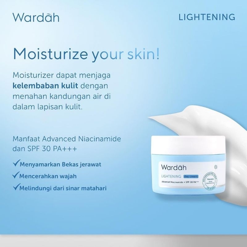 Untuk kulit tampak cantik cerah lembab terlindungi sepanjang hari. Sejak olesan pertama, Wardah Lightening Day Cream bantu mencerahkan kulit secara alami sekaligus memanjakannya agar terasa halus, lembab dan nyaman.