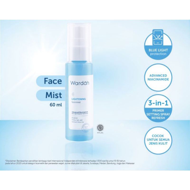 Wardah Lightening Face Mist, 3-in-1 mist untuk primer make up, setting spray, dan refresh kulitdengan Advanced Niacinamide yang mencerahkan & melindungi dari efek negatif blue light.Diformulasikan khusus untuk bantu menjaga tampilan make-up lebih tahan lama... Cocok untuk semua jenis kulit.
