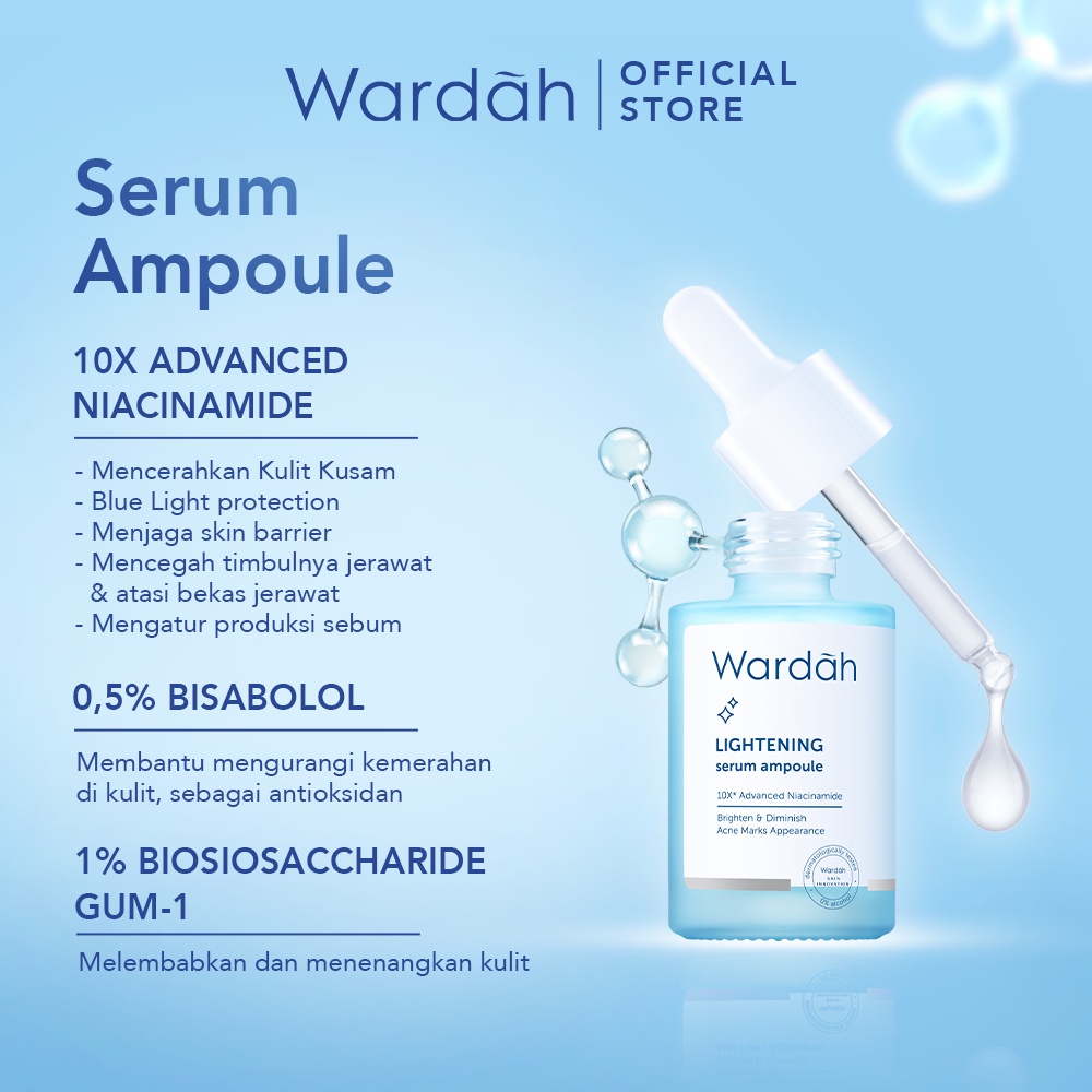 Wardah Lightening Serum Ampoule, Serum dengan 10X Advanced Niacinamide untuk cerahkan wajah 10x lebih kuat, menyamarkan bekas jerawat, dan melindungi dari paparan blue light.