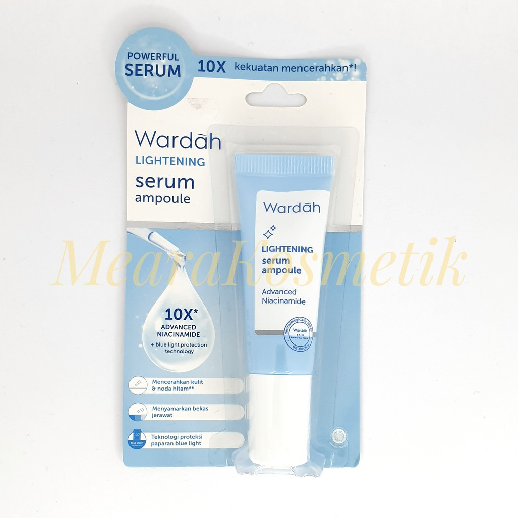 Wardah Lightening Powerful Serum dengan kandungan 10x Advanced Niacinamide lebih cerahkan wajahmu, lebih ampuh samarkan noda hitam/bekas jerawat, dan lebih terlindungi dari efek negatif blue-light yang membuat wajah tampak kusam. Diformulasikan dengan advanced niacinamide yang mencerahkan wajahmu sekaligus melindungi dari efek negatif blue-light yang membuat wajah tampak kusam. Produk berkualitas untuk cerahkan wajah dan berbagai manfaat lainnya dengan harga terjangkau.