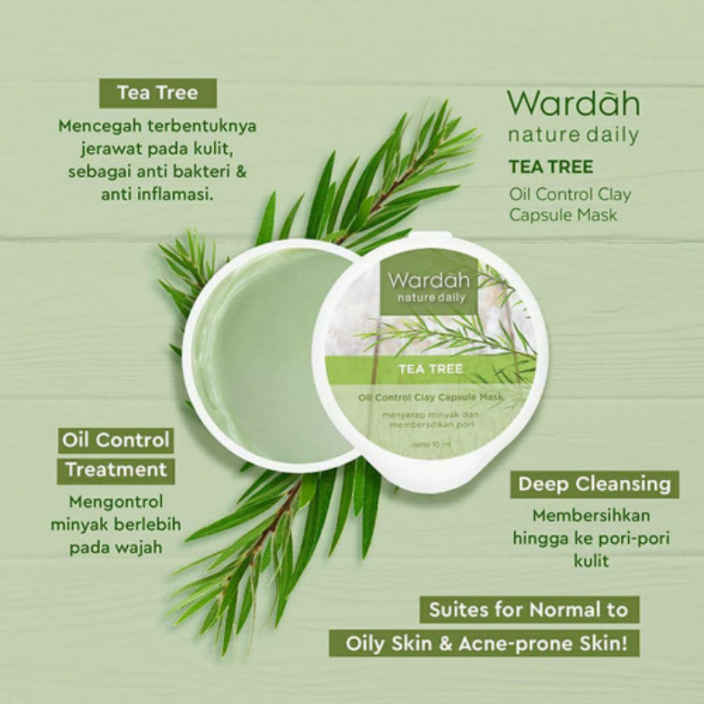 Wardah Nature Daily Capsule Mask - Masker Wajah terdiri dari 5 varian: 1. Wardah Nature Daily Amazonian Acai Berry Antioxidant Capsule Mask: Untuk menjaga kulit dari polusi dan radikal bebas 2. Wardah Nature Daily Tea Tree Oil Control Clay Capsule Mask: Untuk menyerap minyak dan membersihkan pori 3. Wardah Nature Daily Alpine Apple Nutritive Gel Capsule Mask: Untuk merawat tekstur kulit wajah 4. Wardah Nature Daily Milky Oat Exfoliating Scrub Capsule Mask: Untuk mengangkat sel kulit mati 5. Wardah Nature Daily Orange Pomelo Brightening Wash Off Capsule Mask: Untuk mencerahkan wajah