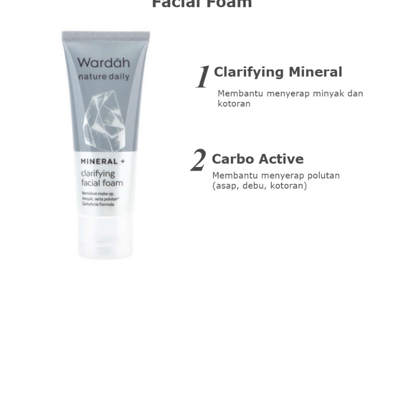 Sabun Wajah Wardah Nature Daily Mineral+ Clarifying Facial Foam mengandung Clarifying Mineral+ yaitu perpaduan beberapa mineral yang berasal dari alam dan dikenal membantu menyerap minyak berlebihan dan kotoran, CarbonActiv formmula yang dikenal sebagai bahan penyerap polutan optimal. Hasil pemakaiannya kulit wajah tampak lebih bersih, segar dan bebas dari minyak berlebihan.