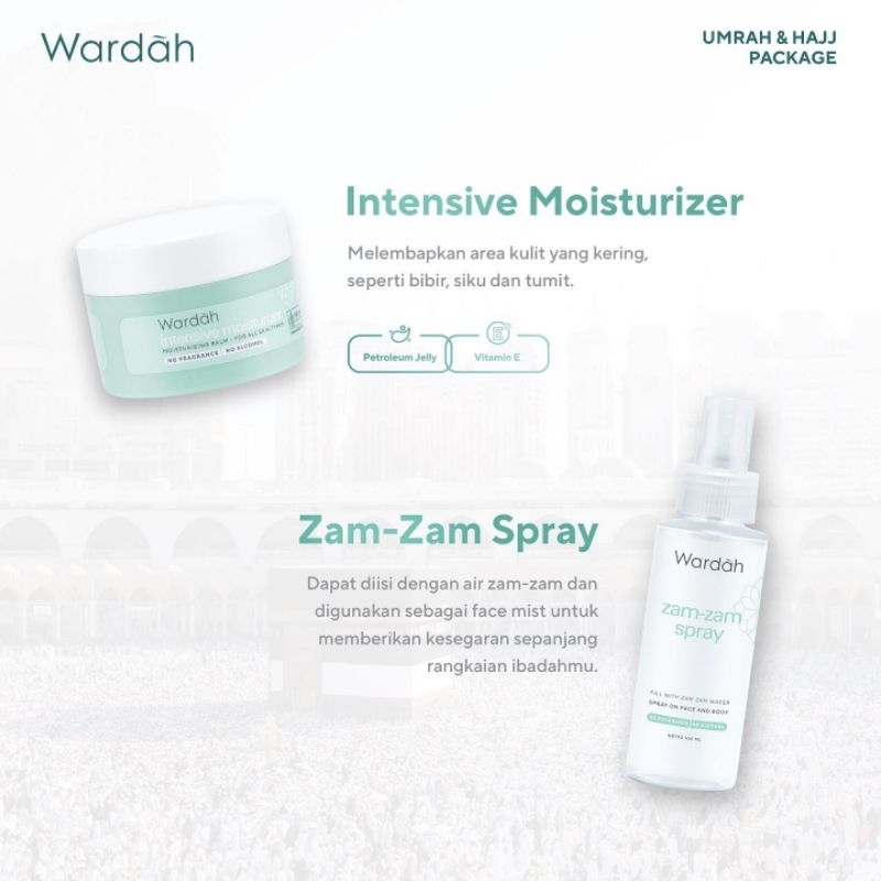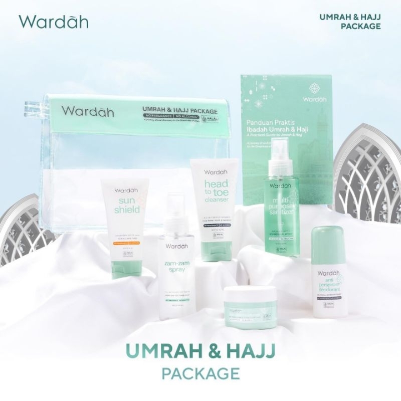 Lengkapi perjalanan Umrah dan Hajimu dengan perawatan kulit head-to-toe menggunakan Wardah Umrah & Hajj Package yang berisikan: - Head to Toe Cleanser - Sun Shielf with SPF 30 PA+++ - Intensive Moisturizer - Zam-zam Spray - Anti Perspirant Deodorant - Multipurpose Sanitizer - Tas Serut - Buku Panduan