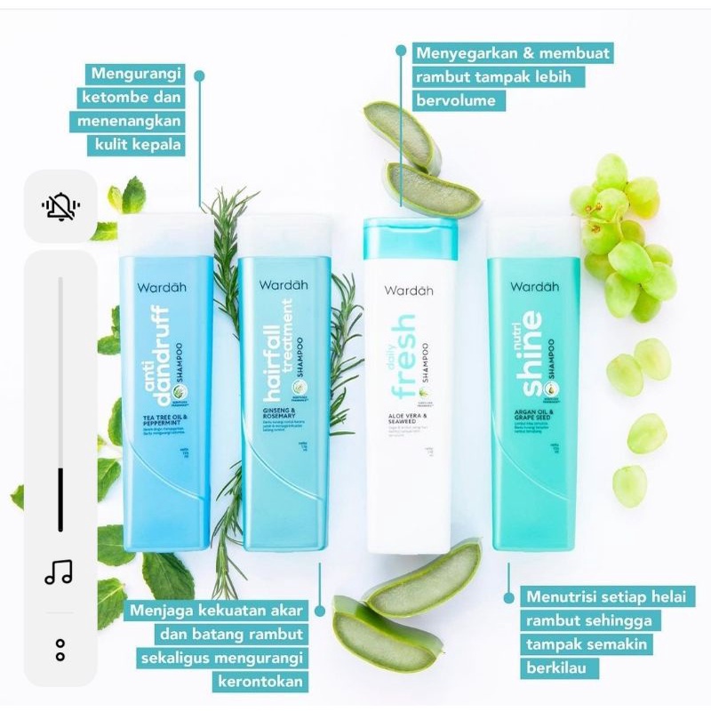 1. Anti Dandruff Sering merasa terganggu karena kulit kepalamu gatal akibat ketombe? Sekarang gak usah khawatir lagi. Karena ada Wardah Shampoo Antidandruff yang membantu mengurangi ketombe pada kulit kepala dengan paduan bahan aktif natural multiaksi. Dengan Tea Tree Oil, Peppermint Extract dan Double Zinc Active bantu mengurangi ketombe dan memberikan sensasi segar pada kulit kepala. 2. Nutri Shine Punya masalah rambut rusak dan kusam? Berada di bawah sinar matahari memang tidak hanya membuat kulit wajahmu jadi hitam dan kusam, tapi juga membuat rambutmu rusak.Panas dari alat-alat seperti catok ataupun hairdryer juga bisa membuat rambutmu rusak loh! Tapi sekarang Kamu gak perlu khawatir lagi karena ada Wardah Shampoo Nutrishine yang bantu pancarkan cahaya rambut sehingga rambut tampak sehat! Dengan paduan bahan aktif Argan Oil dan Grapeseed Extract yang bantu menutrisi setiap helaian rambut dan melindunginya dari kerusakan. 3. Hairfall Treatment Rambut yang mulai tipis karena rontok sekarang bisa Kamu atasi dengan Wardah Shampoo Hairfall Treatment, dengan kandungan ginseng dan rosemary extract bantu menguatkan akar rambut dan bantu meningkatkan proses tumbuhnya rambut. 4. Daily Fresh Cuaca yang panas bikin kepala jadi ikut panas, apalagi setelah seharian bekerja, Kamu butuh shampoo yang bikin fresh! Wardah Shampoo Daily Fresh adalah sampo yang menyegarkan dan membuat rambut terasa lebih lembut dengan paduan bahan aktif natural multiaksi. Aloevera dan Seaweed extract bantu menutrisi dan menyegarkan rambut dan kulit kepala. Kamu harus coba sendiri dan rasakan kesegaran Wardah Shampoo Daily Fresh!