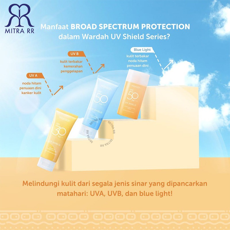 c. Wardah UV Shield Active Protection Serum SPF 50 PA++++ (35ml) sunscreen dengan Broad Spectrum Protection, 50x lebih optimal* menjaga kulit dari sinar UV A / UV B serta pancaran blue light berlebih. Dengan inovasi formula 0% alkohol namun tetap ringan dan tidak lengket, serta Waterproof Active di dalamnya yang menjadikan sunscreen tidak mudah luntur meski terkena air dan keringat. Sangat cocok digunakan untuk aktivitas dinamis di bawah paparan sinar matahari, seperti olahraga lari, berenang, berjemur di pantai, dll.