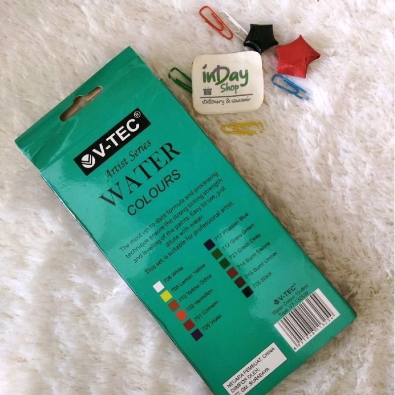 Water color atau cat air Merk V-tec, diaplikasi menggunakan kuas dan palet untuk keperluan melukis atau menggambar