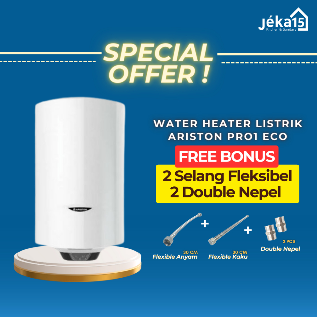 Spesifikasi: - Tipe : ARISTON PRO 1 ECO 50 - Kapasitas : 50 liter - Pemasangan : Vertikal - Daya Listrik : 1200watt - Tegangan : 220volt - Temperatur kerja maks : 80C - Tekanan kerja maks : 8 Bar - Indeks proteksi : IPX3 - Dimensi : 450 * 470 * 553 mm
