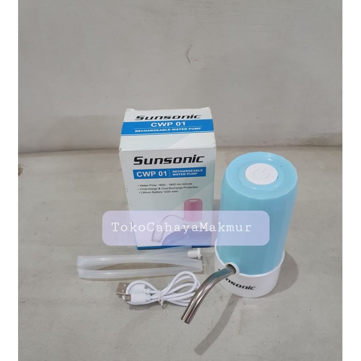 Spesifikasi : Merek : Sunsonic Type : CWP 01 Bahan: ABS + air stainless steel Voltage: 5V Listrik: 4W Daya : Port USB Baterai : Litinium 1200 mAh Selang : Silikon Foodgrade Ukuran Galon : Cocok untuk semua ukuran Galon