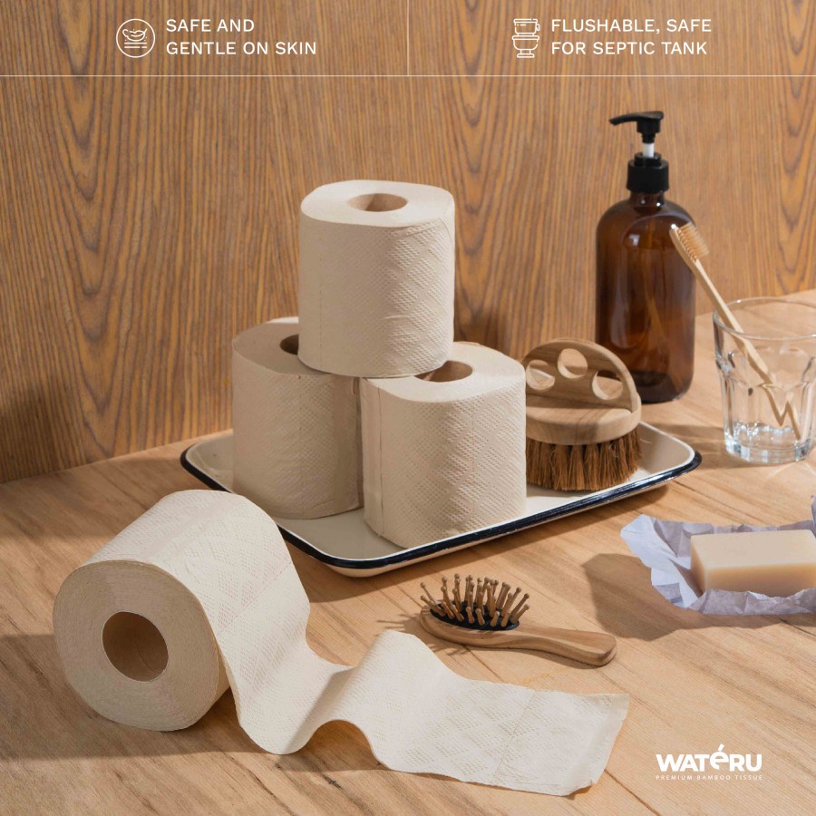 Fitur : - 100% Natural, Unbleached & Chemical Free Wateru Premium Bamboo Tissue diproduksi dengan proses yang bebas dari bahan kimia berbahaya seperti BPA, formaldehyde, klorin, pewangi atau bahan penghilang tinta. Karena tidak diputihkan, kertas tisu kami tidak berwarna putih, melainkan kecoklatan sebagaimana warna asli bambu - Stronger, Softer & Super Absorbent Selain lembut dan halus, Wateru Premium Bamboo Tissue juga memiliki serat yang lebih panjang dan kuat, sehingga memiliki daya serap yang lebih tinggi dan tidak mudah robek atau hancur ketika digunakan untuk membersihkan permukaan yang basah, dibandingkan dengan kertas tisu yang terbuat dari kayu. - Hypoallergenic & Naturally Anti-bacterial Selain lebih aman bagi kulit, Wateru Premium Bamboo Tissue juga memiliki sifat hypoallergenic secara alami karena hampir tidak memiliki partikel debu yang biasa terdapat pada tisu yang terbuat dari kayu, sehingga dapat mengurangi efekiritasi bagi penderita rinitis, alergi, atau pada kulit sensitif. Bambu juga memiliki zat anti mikroba dan anti jamur alami yang disebut “ZhuKun” yang dapat mengurangi pertumbuhan bakteri dan jamur pada kertas tisu dan kulit manusia. - 100% Bio-degradable, Sustainable & Eco-friendly Terbuat dari 100% bubur kertas bambu dari hutan budidaya bambu dan 100% bio-degradable. Dapat sepenuhnya hancur ke dalam tanah, sehingga membuatnya aman bagi lingkungan, sekaligus mengurangi deforestasi hutan tropis.