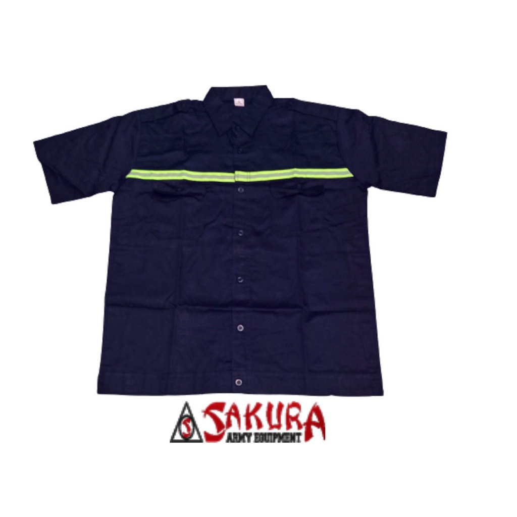 Wearpack Safety Atasan Baju Wearpack Lengan Pendek Biru Dongker - bahan twill halus(exclusive) - warna biru dongker dan tersedia warna lain: biru benhur, dongker, merah, abu abu - model skotlet kecil 3cm - ukuran M- L5 - 2 kantong di dada kiri dan kanan -1 kantong khusus menaruh pena menaruh pena - scotlight menyala jika terkena sinar - untuk bordir tambahan dijual terpisah