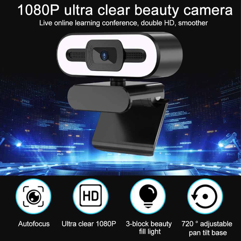 Komputer & Aksesoris > Aksesoris Desktop & Laptop > Webcam > Webcam Laptop HD 1080P USB Kamera PC Camera with LED Ring Light Mic Webcast Live Zoom Meeting Camera Broadcast Video