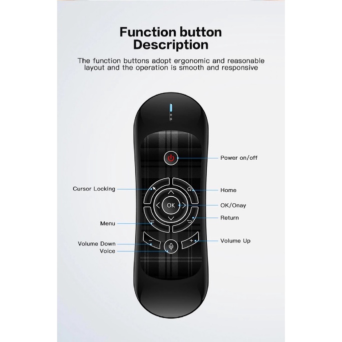 NB: - Can automatically detect the face-up side and disable the buttons of the face-down side, when the keyboard is facing up, the air remote does not work - "Cursor lock" and "Voice" keys can't be learned - If the return key does not work, please press and hold the "OK" + "Return" keys for 5 seconds. The blue indicator will flash 8 times, and then the air remote will be reset - Only support for Google Voice Assistant on Android devices, and does not support other voice software platforms