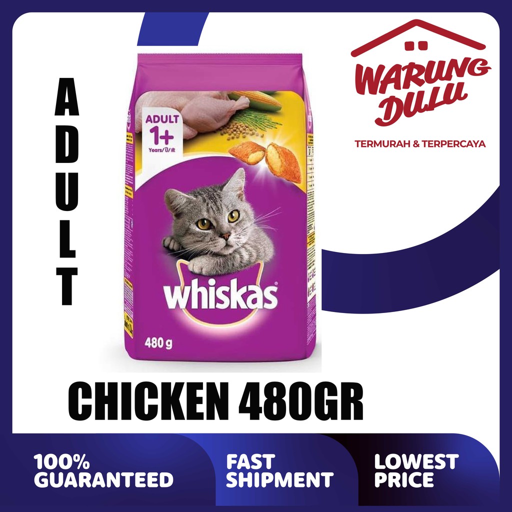 eskripsi Whiskas Chicken 480 gr - Makanan Kering Kucing WHISKAS mengerti akan kandungan nutrisi yang dibutuhkan oleh kucing dan setiap produk secara spesifik di formulasikan dengan kandungan nutrisi yang lengkap dan seimbang. -Mengandung Omega 3 & 6 , serta Zinc untuk kesehatan kulit dan bulu yang indah. -Mengandung Vit.A dan taurine untuk kesehatan matanya -Mengandung protein dari ikan yang segar, lemak yang baik, vitamin dan mineral yang seimbang, untuk tetap menjaga kucingmu aktif dan bahagia.