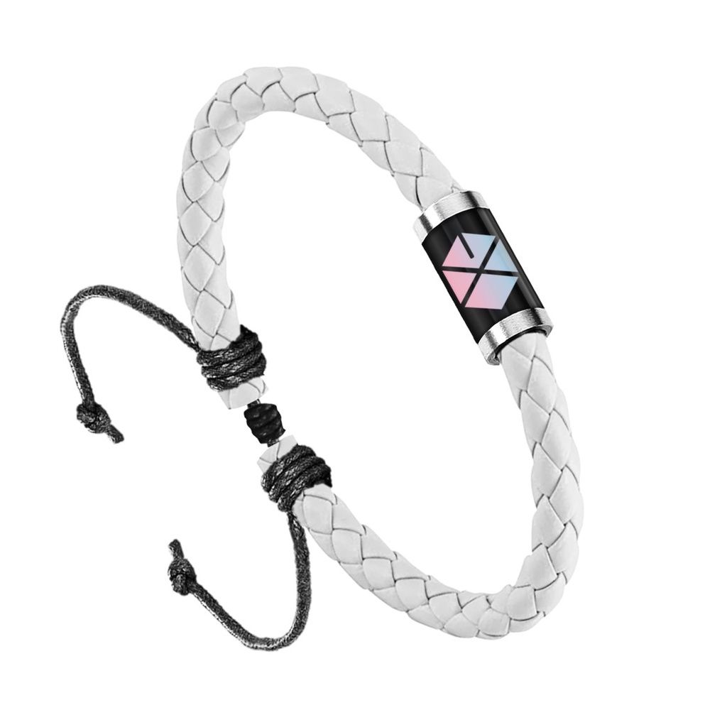 White Edition - Gelang Simple Kulit Logo Band KPOP Korea Bisa Custom Nama Gambar Bahan Tali Kulit Putih Kepang Tabung Stainless Steel BTS EXO BLACKPINK TWICE NCT SEVENTEEN