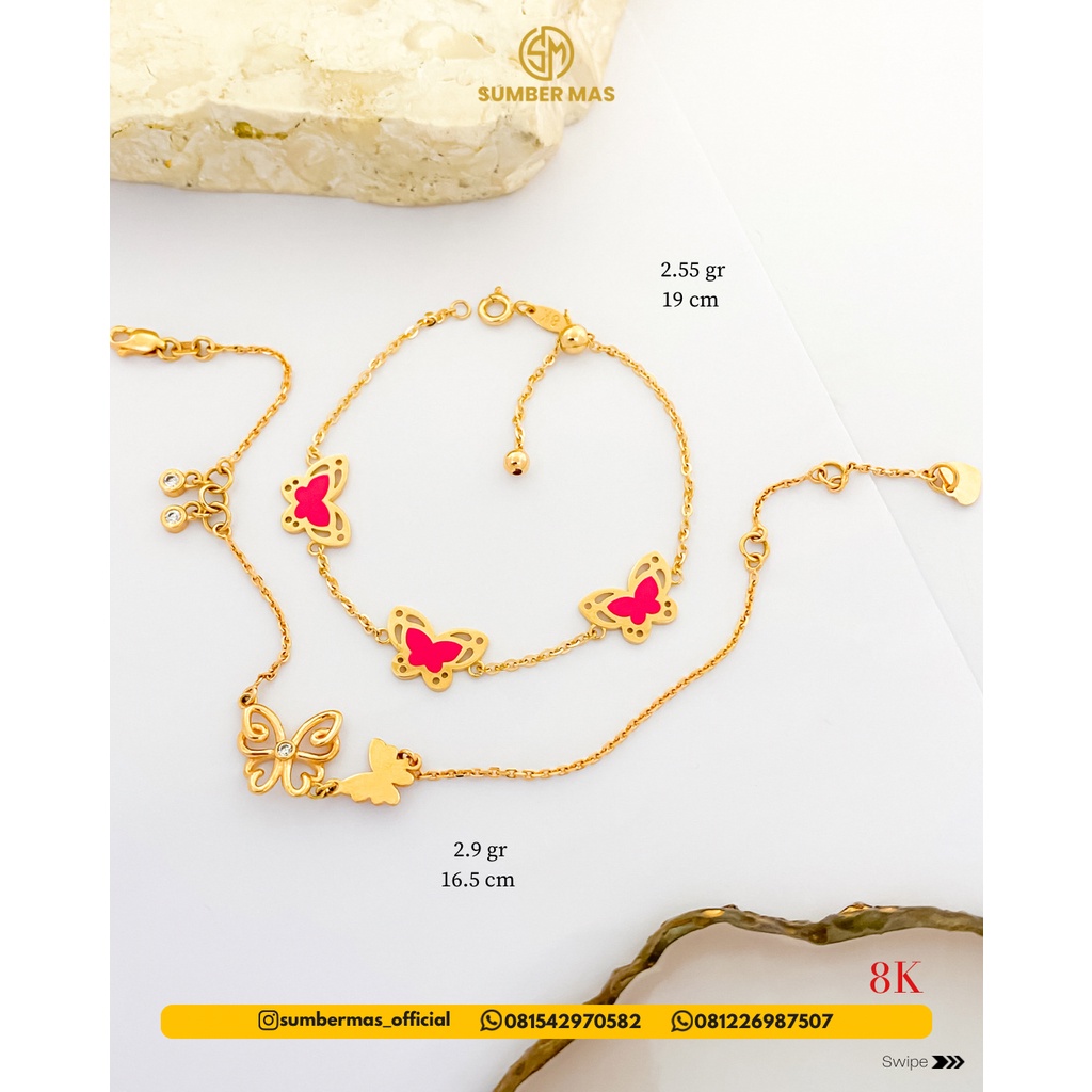 Nama Barang : WHITE GOLD SERIES & GOLD BUTTERFLY BRACELET Berat : 2.5gr - 3.35gr Ukuran : 17 - 18cm Variasi : GOLD & WHITE GOLD Kadar Emas : 8K (375) Keuntungan Membeli Perhiasan di Toko Emas Sumber Mas