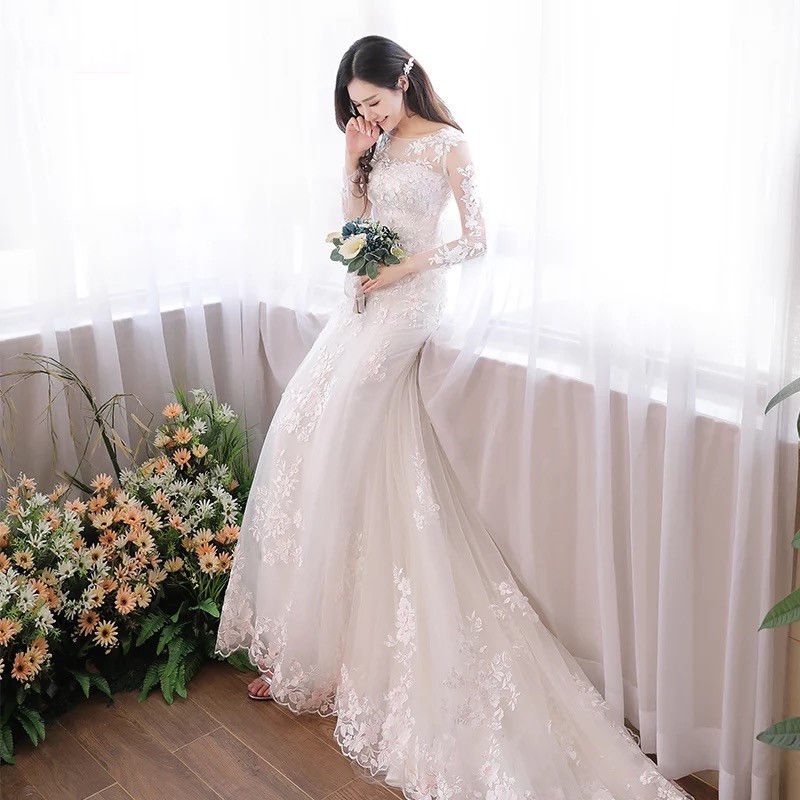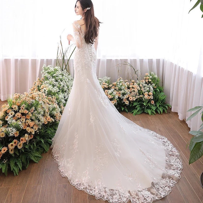 Detail White Lace Long Sleeve Slim Fit Mermaid Long Tail Bridal Dresses Fishtail Wedding Dresses