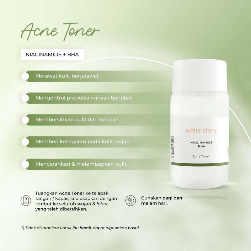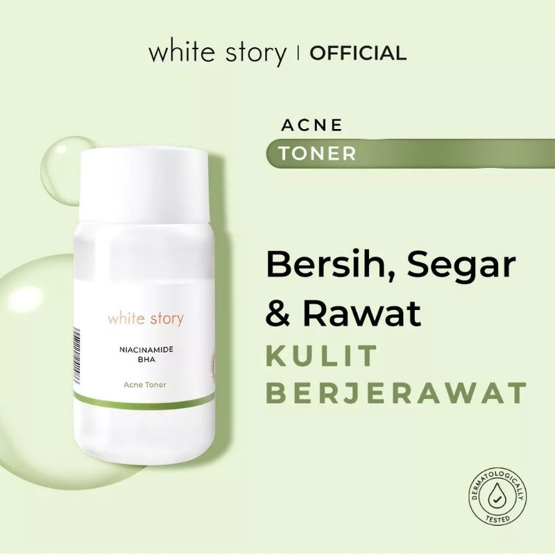 Dengan kedua kandungan tersebut, White Story Acne Toner bermanfaat untuk - Merawat kulit yang berjerawat - Membersihkan kulit dari minyak, debu, dan kotoran - Mencerahkan & melembabkan kulit - Memberi kesegaran pada kulit wajah - Membantu mengontrol produksi minyak berlebih