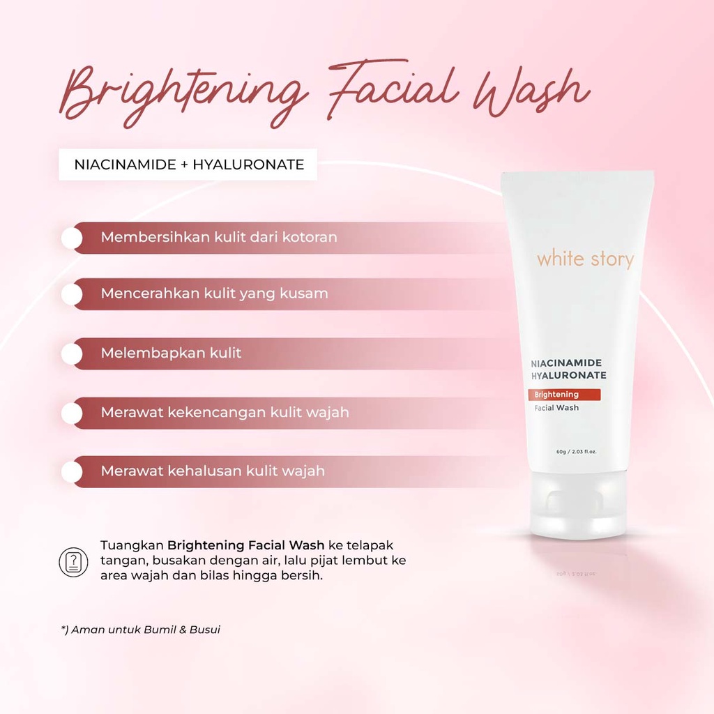 Cara pakai: 1. Bersihkan wajah dengan White Story Brightening Facial Wash 2. Gunakan White Story Brightening Toner 3. Oleskan Day Cream pada pagi/siang hari dan Night Cream pada malam hari