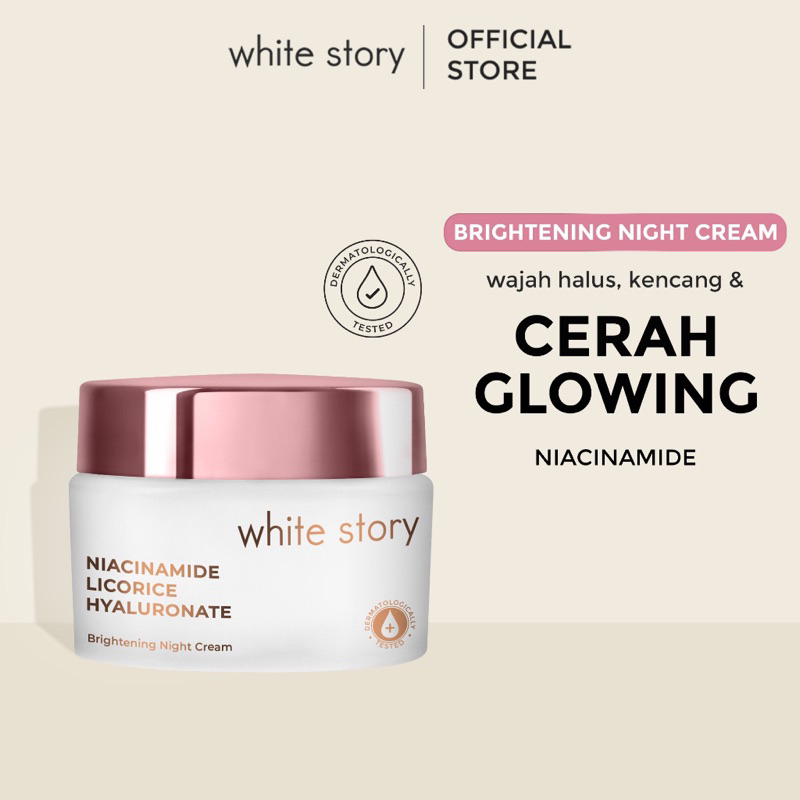 Dengan kandungan tersebut, White Story Brightening Night Cream bermanfaat untuk: - Melembabkan kulit - Mencerahkan kulit yang kusam - Menenangkan kulit yang iritasi / kemerahan - Menstimulasi produksi kolagen sehingga dapat merawat kekencangan kulit wajah - Membantu memperkuat skin barrier - Merawat kekencangan & kehalusan kulit wajah