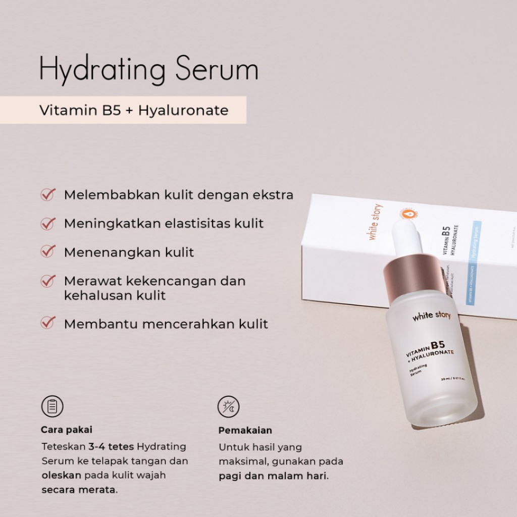 Dengan kandungan tersebut, White Story Hydrating Serum bermanfaat untuk: - Melembabkan kulit dengan ekstra - Merawat kekencangan dan kehalusan kulit - Meningkatkan elastisitas kulit - Karena sifatnya yang melembabkan, maka dapat juga bermanfaat untuk menenangkan kulit - Membantu mencerahkan kulit
