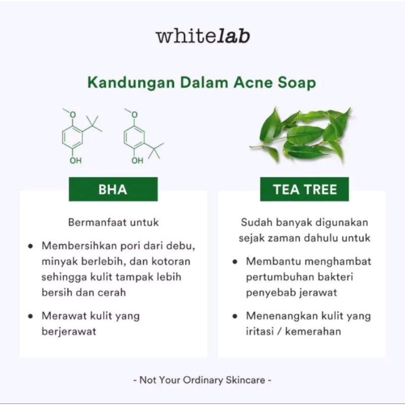 BHA bermanfaat untuk membersihkan pori dari debu, minyak berlebih, dan kotoran sehingga dapat merawat kulit yang berjerawat serta kulit akan tampak lebih bersih & cerah. Tidak hanya BHA, Whitelab Acne Soap juga dilengkapi dengan Tea Tree yang sudah banyak digunakan sejak zaman dahulu untuk membantu menghambat pertumbuhan bakteri penyebab jerawat serta menenangkan kulit yang iritasi/ kemerahan.