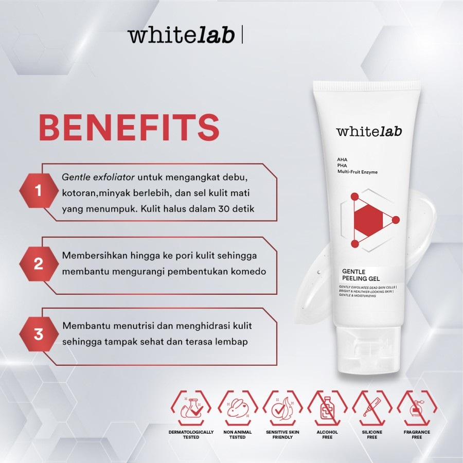 Inovasi terbaru dari Whitelab, Gentle Peeling Gel dengan Teknologi Hybrid Peeling 2 in 1, membantu mengangkat sel kulit mati dengan lembut sehingga wajah menjadi bersih, halus, lembap serta tampak lebih cerah terawat. Diformulasikan dengan kekuatan kandungan utama AHA (Lactic acid), PHA (Gluconolactone) yang merupakan gentle acid, membantu mengangkat sel kulit mati dan membersihkan kotoran hingga ke pori. Gabungan dengan Multi-Fruit Enzyme (Papain dan Bromelain) yang diekstrak alami dari buah bekerja sinergis untuk membantu mempercepat proses regenerasi kulit sehingga membuat kulit terasa cerah, halus, dan lembut.
