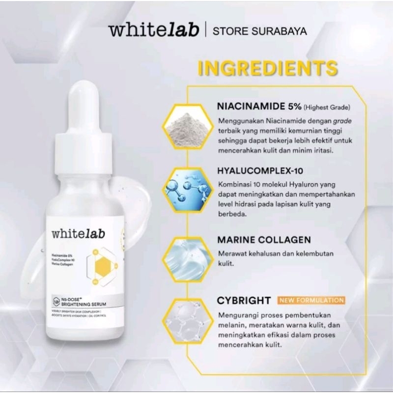 Whitelab Brightening Booster Serum dengan kandungan Niacinamide 5%, HyaluComplex-10, dan Marine Collagen bekerja sinergis mencerahkan dan menutrisi kulit membuat wajah tampak lebih cerah, lembab dan glowing alami.